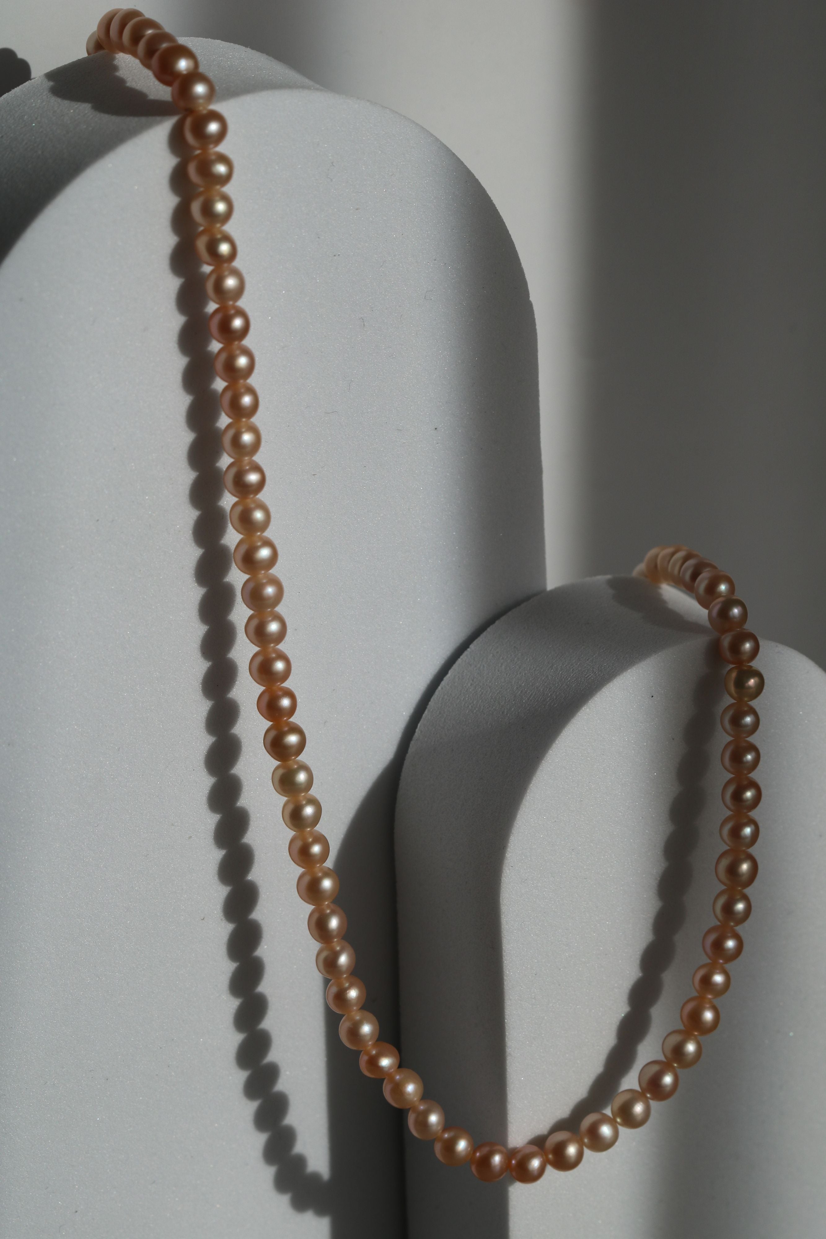 Colier cu perle de cultură roz, prezentat pe suport minimalist