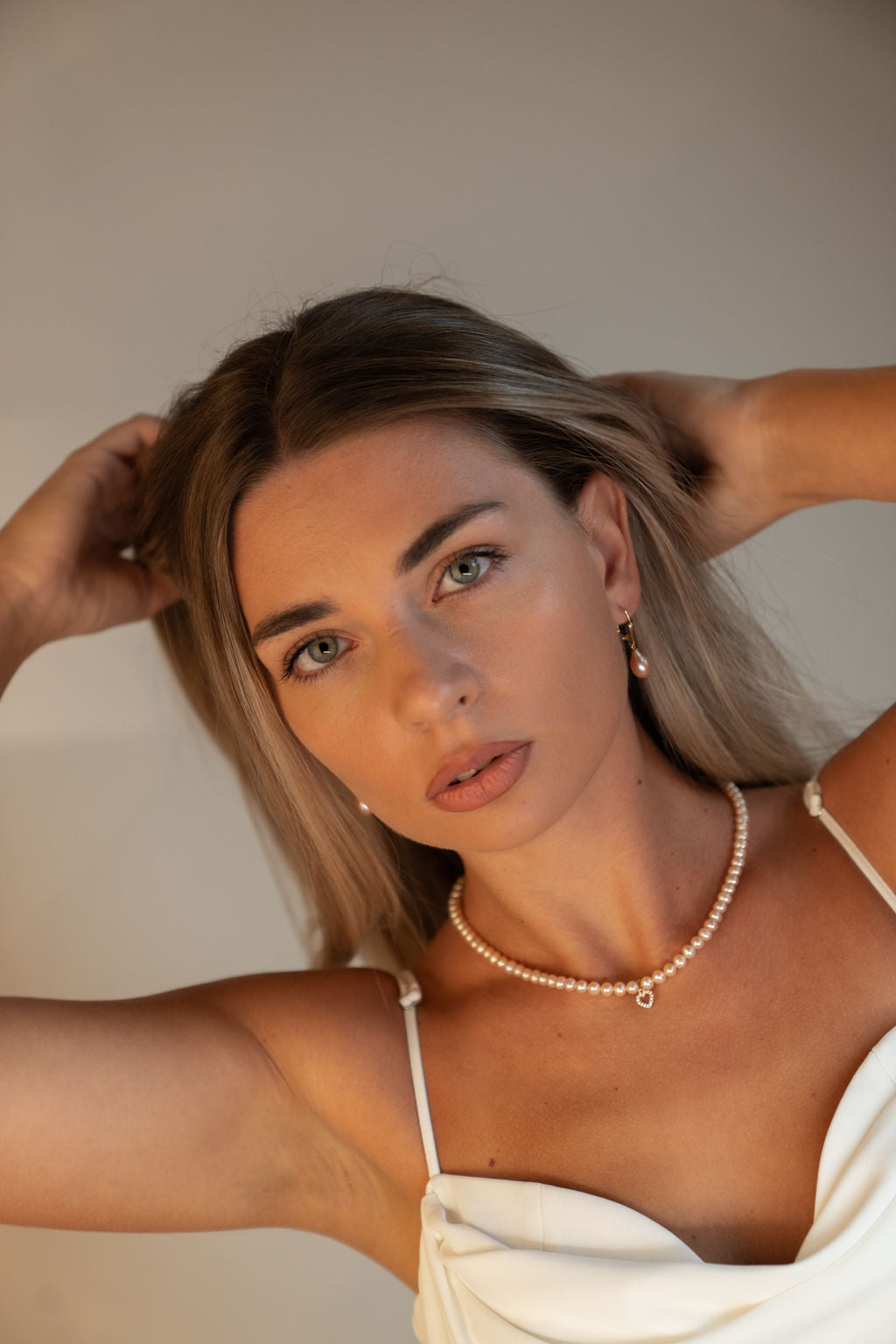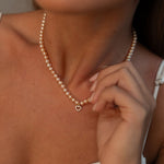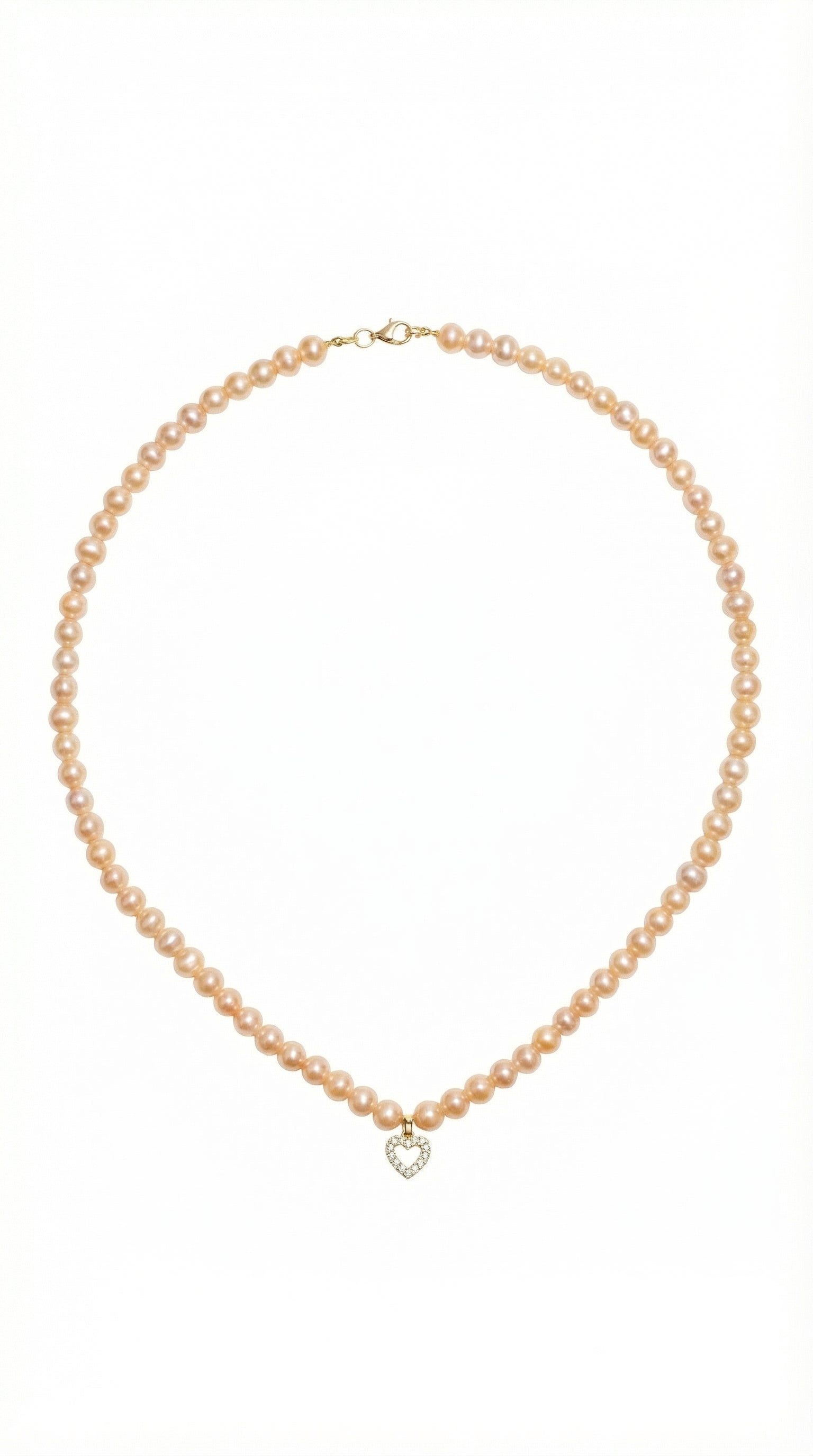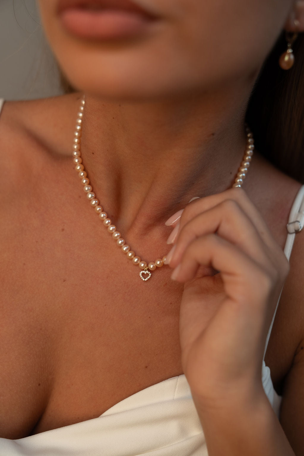 Lumin Heart aduce o notă caldă de roz în linia clasică de perle — iar pandantivul fin din aur 14K in forma de inimă daugă strălucirea perfectă.